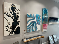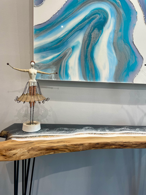 Suzanne works predominately with epoxy resin, using her fingers as her tool. The art begins to take on it’s own life, flowing freely. Each layer, carefully poured and manipulated, contributes to the piece’s depth and complexity, drawing the viewer into its radiant embrace.
